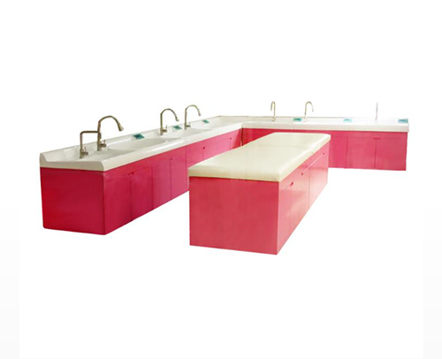 A.抚触台面、洗礼池、游泳池及功能低背护板都采用优质改性PMMA进口高分子复合材料分段式一体吸塑成型,具有抗压强度高,弹性好,表面光洁易清洗。洗礼池、游泳池及台面采用防泛水设计,清洗溅到台面的液体会全部流入下水道。前端采用大圆弧造型设计,为护理洗浴人员提供腰腹部的得力支撑,有效缓解使用人员疲劳与不适,低功能挡背板婴儿洗浴台采用斜度设计可节省空间,有很好的视觉感。整体简洁大方.