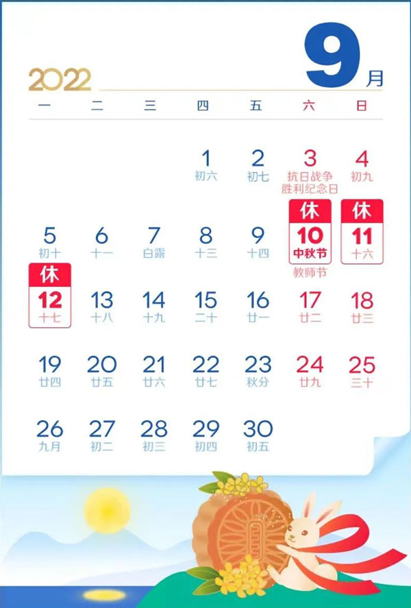 赏月 赏月的风俗来源于祭月,严肃的祭祀变成了轻松的欢娱。据说此夜月球距地球最近,月亮最大最圆最亮,所以从古至今都有饮宴赏月的习俗.吃月饼 月饼,又叫月团、宫饼等。月饼最初是用来祭奉月神的祭品,后来人们逐渐把中秋赏月与品尝月饼,作为家人团圆的一大象征。祝大家中秋节快乐,合家团圆。2022年万科网络公司中秋节放假安排根据《国务院办公厅关于2022年部分节假日安排的通知》精神,2022年中秋节放假安排如下:9月10日至9月12日放假,共3天。
